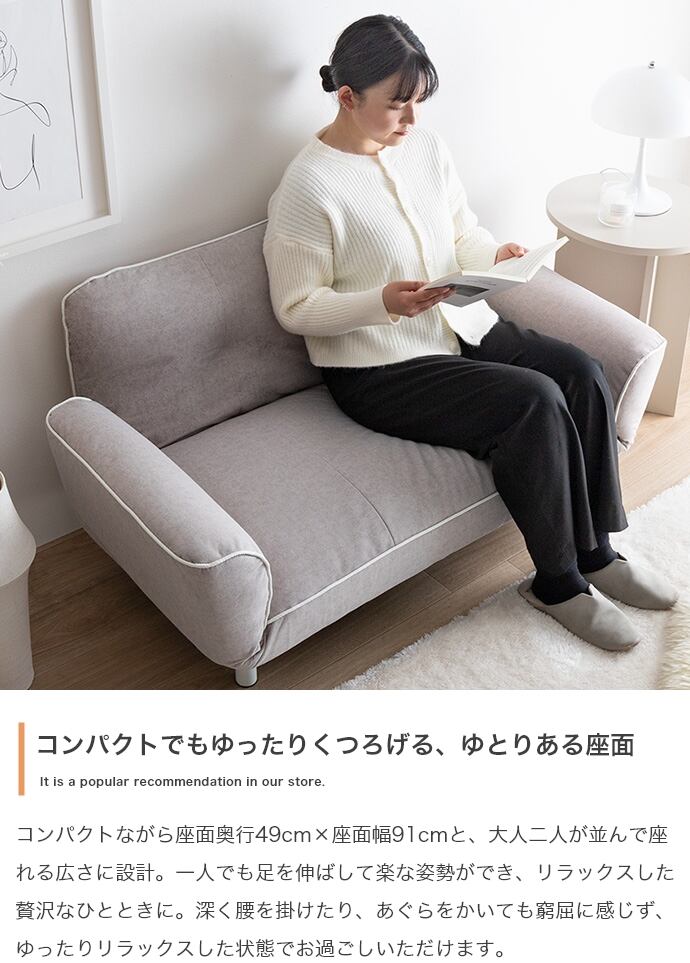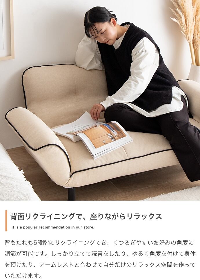 ころんとしたフォルムとパイピング加工が可愛い『Pique(ピケ)』リクライニングソファ。6段階でリクライニングする背もたれとアームレストはお好みの角度で調節ができ、自分だけのくつろぎ空間が作り出せます。バイカラーのパイピングはソファの柔らかな可愛さを引き出し、置くだけでお部屋のアクセントに。また、お部屋に圧迫感を与えないロー設計のため、1人暮らしやワンルームの方にもおすすめです。