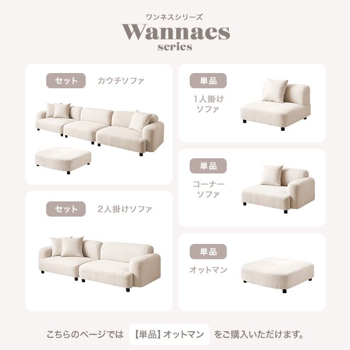 高級感漂うデザインが特徴の『Wannaes(ワンネス)』シリーズのオットマン。丸みのあるフォルムはお部屋の主役となり、目を惹くデザインです。視覚的な心地よさと無駄のないシンプルデザインは、韓国インテリアや北欧スタイルなどシンプルで洗練された空間に自然と溶け込みます。また、シリーズで揃えるとお部屋の間取りやシーンに合わせて自由自在にレイアウトが可能です。低めの座面×幅広設計で、お部屋への圧迫感を抑えつつもゆったり贅沢にくつろげるソファに仕上げました。