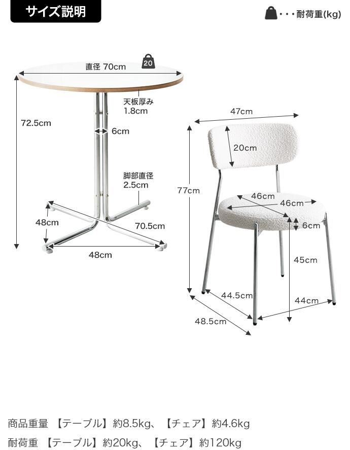 〇重量:【商品重量】テーブル:約8.5kg、チェア:約4.6kg 【耐荷重】テーブル:約20kg、チェア:約120kg