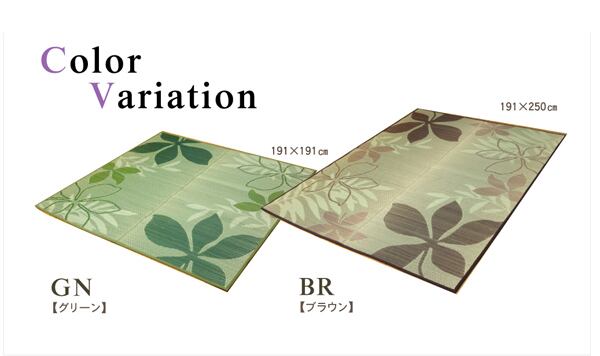 印象的な夏らしいリーフ柄です。ウレタン3mmを挟んでおりますので、少々クッション性があります。裏はスベリ止め付の不織布です。い草にヒバエッセンス加工を施しています。(抗菌防臭効果)