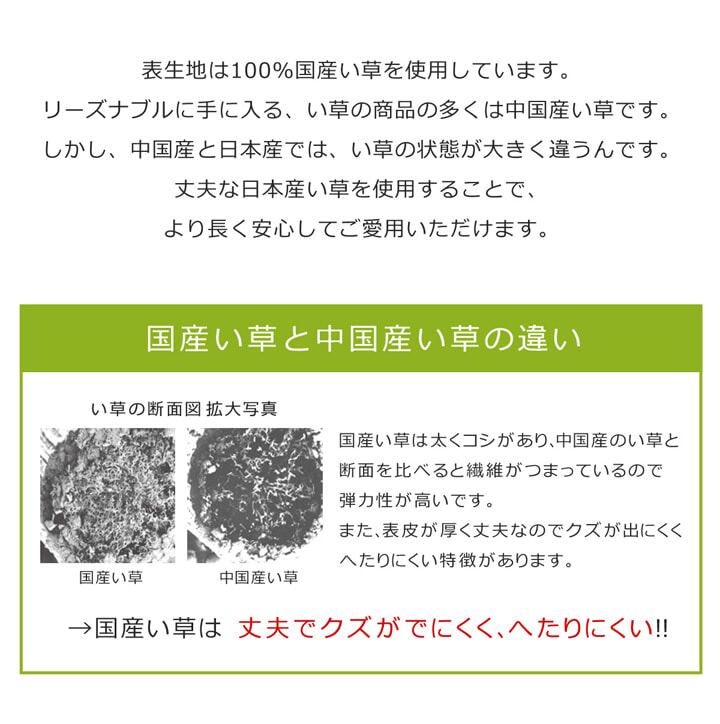 〇素材:側地=い草(※メセキ織) 中材=固綿(ポリエステル)15mm ヘリ=綿100% 裏地=い草(※メセキ織)