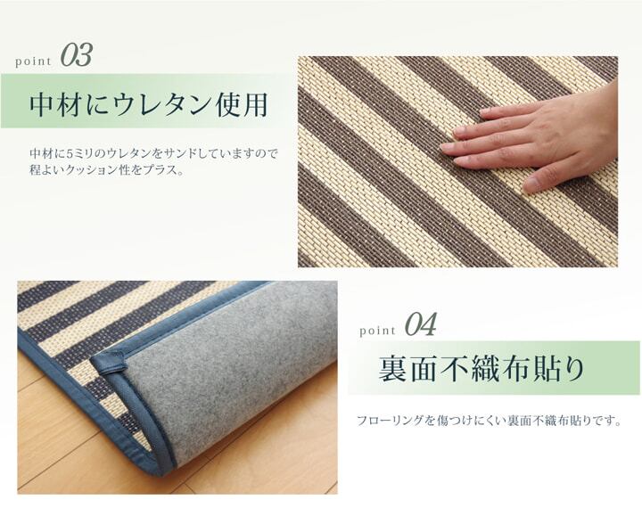 マリンテイストのバンブーラグです。竹の素材感を残しながら、カラー糸によりデザインを表現しています。さらっとした足触りと裏面に不織布を使用しているため底付き感を軽減してくれます。フローリングにもぴったりの商品です。竹は耐久性に優れ、熱伝導率が高いため自然のひんやり感があります。