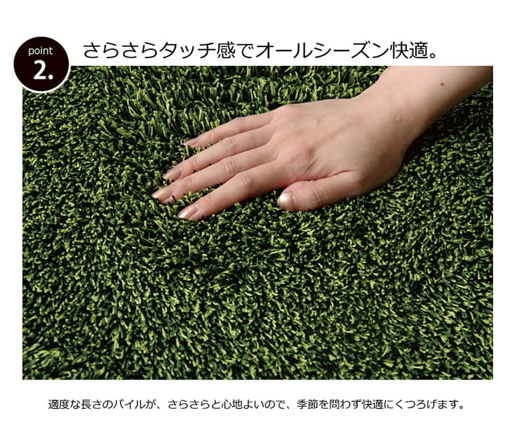 先染め糸を使用した3色MIXラグです。多色多サイズ展開ですの、お部屋に合わせてお選び下さい。3色のうち1色アクセントカラーを使用し、いままでにない色合いを表現しました。ナチュラルカラーで家具との相性も高く、高級感あふれる風合いで、ニーズに合ったお部屋を演出できます。パイル長約20mmで適度な長さで、サラサラとしたタッチ感で暑い時期にもべとつきません。ホットカーペット、床暖房にも対応しております。季節を選ばずオールシーズンご使用頂ける商品です。裏にはフローリングを傷つけにくいよう不織布を貼っています。また、すべりにくい加工も施していますので、部屋を走り回るのが大好きなお子様やペットがいるご家庭にも安心してご使用頂けます。ヘリ部分はヘムをまかずにオーバーロック加工で仕上げました。お部屋に敷いて頂いた際の見た目にもこだわりました。多サイズ展開でワンルームから子ども部屋、リビング・ダイニング、ベッドサイド、ソファー前にも、いろいろなシーンに合わせてお選び下さい。