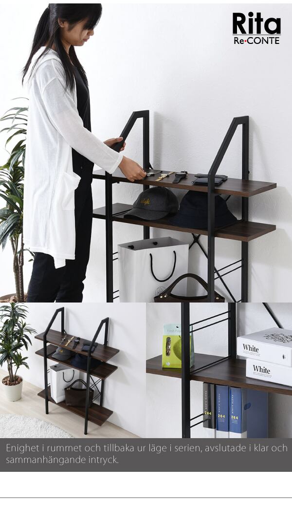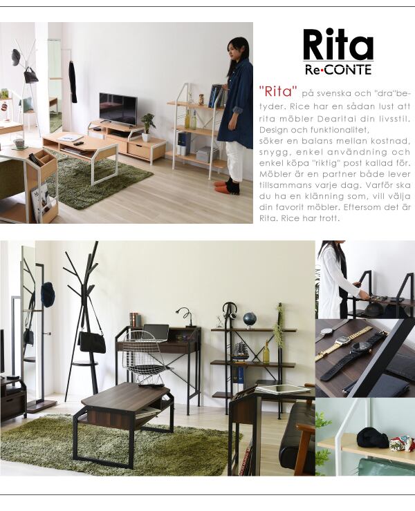 Ritaシリーズは熱や水に強く、傷がつきにくいので、メンテナンスが容易です。スチールは鋭角な部分を排除し、やさしい作りになっています。シェルフは棚板が左右に可動します。上下段は左右3段階設定可能、中段は無段階に左右可動します。また、中段の棚板は3段階に高さ設定が可能なので、レイアウトに合わせて自由に設定できます。