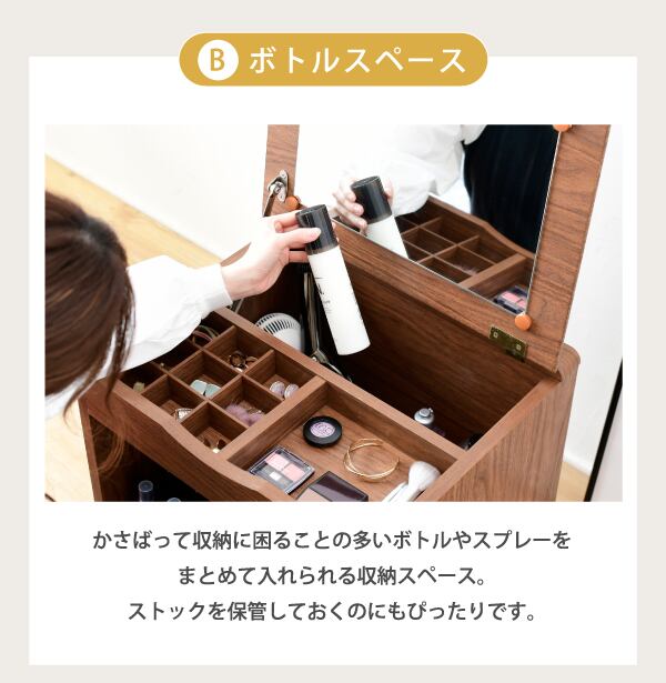 収納するものから設計されたデザインだから、コンパクトでも機能的。ミラーのついた扉を開けるとたっぷりの収納スペースが。アクセサリー類などの小物や、口紅等の小物化粧品、奥には整髪料や化粧水などの背の高いものも収納できます。丸みのある北欧風のデザインはとてもおしゃれで、ひとり暮らしのお部屋にもぴったりです。