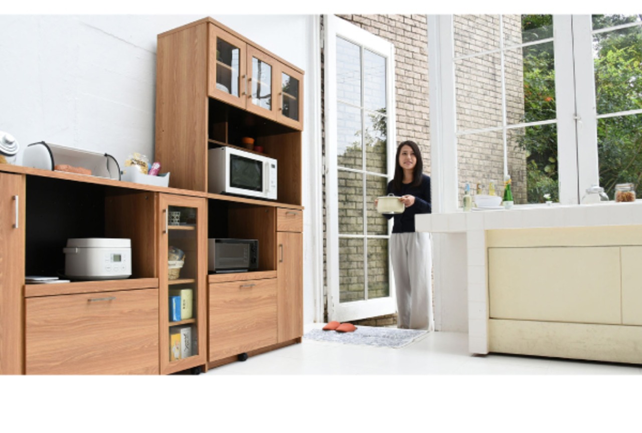 置くものを選ばない食器戸棚付きレンジ収納ラック。これ一台でおしゃれな北欧キッチンに早変わり! キッチン家電 食器 すべてが収まります。デザイン性、機能性、収納力に富んだ実力派のレンジ台。