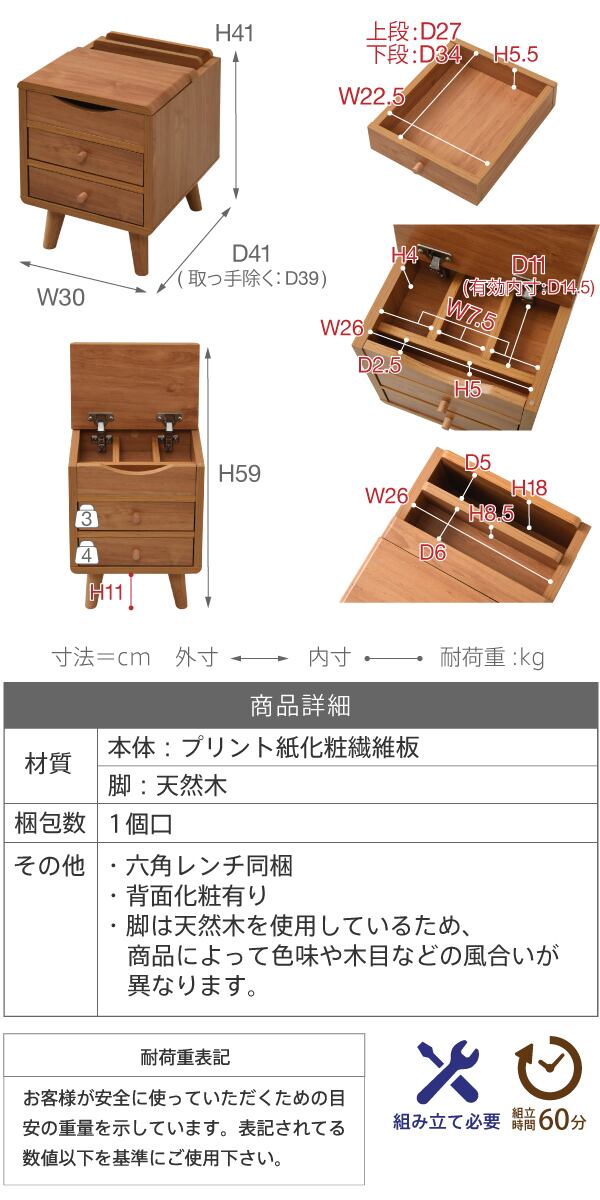 収納するものから設計されたデザインだから、コンパクトでも機能的。薄型の引き出し2段と、奥には雑誌を立てて収納できるオープンスペース付き。さらに天板を開くと仕切り付きの収納部もあるので整理整頓も簡単。丸みのある北欧風のデザインはとてもおしゃれで、コンパクトなのでひとり暮らしのお部屋にもぴったりです。
