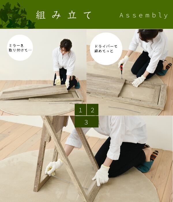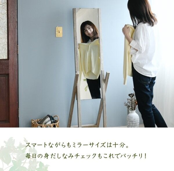 優しい色調で味わい深い古木風シートを採用したデザインが、お部屋全体にすっきりとした印象を与えるスタンドミラー。圧迫感のないシンプルなデザインは、お気に入りの小物や観葉植物、ドライフラワーなどを一層際立たせてくれます。全身を映してくれるミラーはお出かけ前の必需品。フック部分にはストールや帽子などを掛けられます。