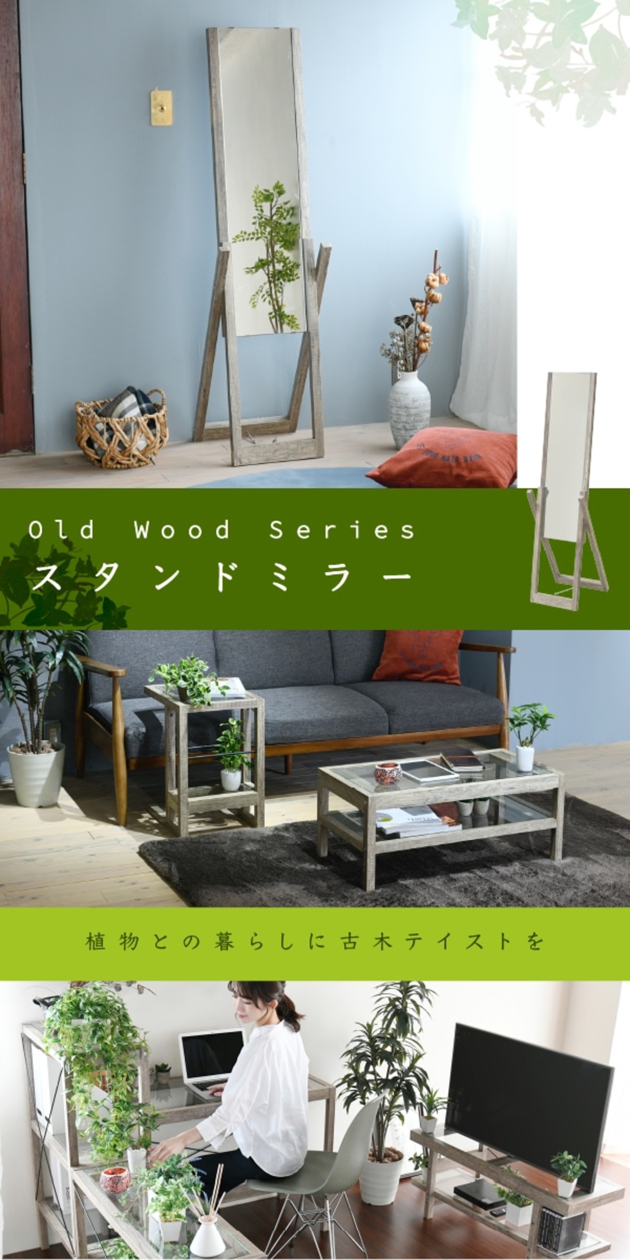 味わいのある古木風シートを採用したデザインが、お部屋全体にすっきりとした印象を与えるスタンドミラー