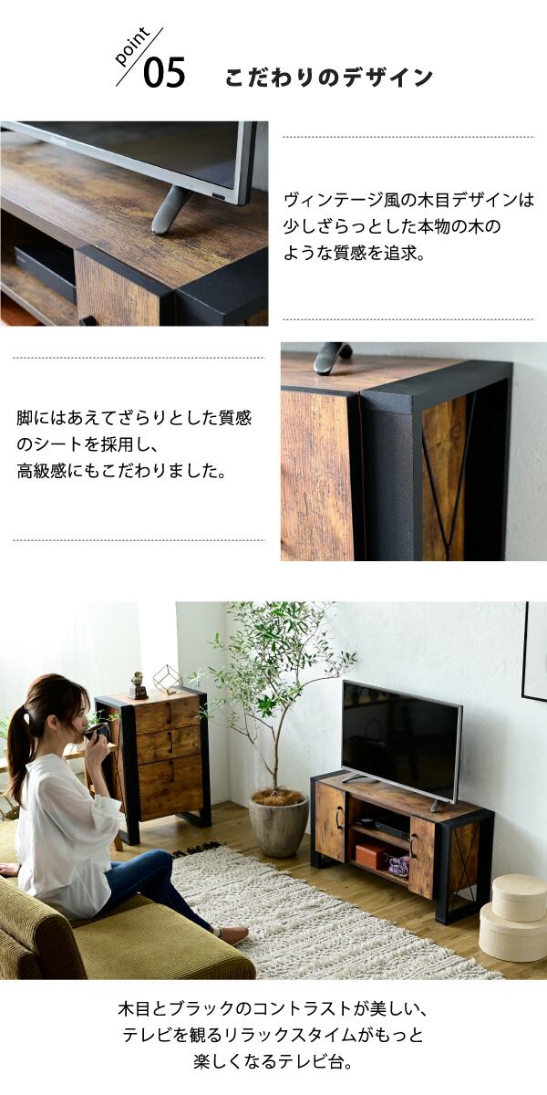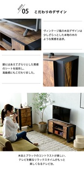 ヴィンテージ風シートがおしゃれなブルックリンスタイルのテレビ台。無骨すぎないデザインで男女問わずご使用いただけます。可動棚で収納も柔軟に対応。