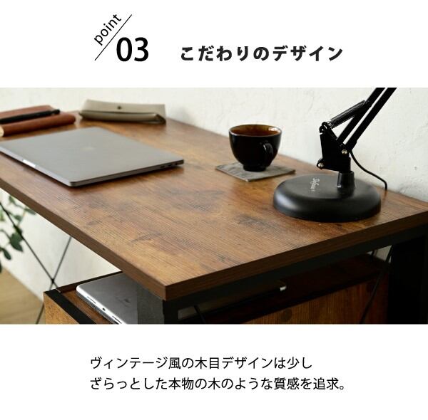 ヴィンテージ風シートがおしゃれなブルックリンスタイルのデスク。無骨すぎないデザインで男女問わずご使用できます。A4ファイルも収納できる大小2つの引き出し付き。
