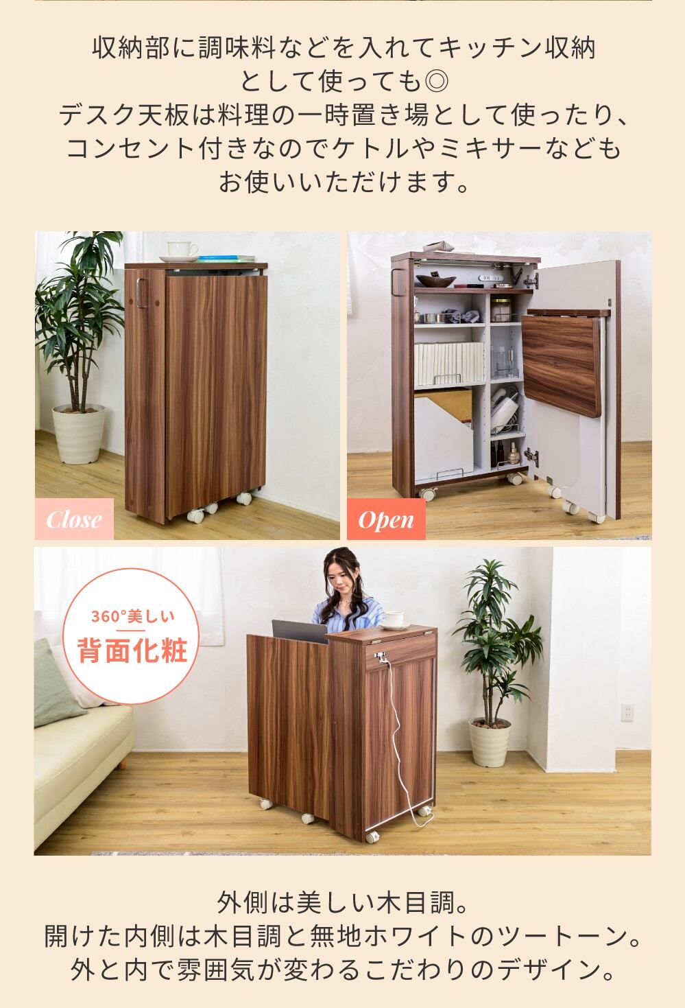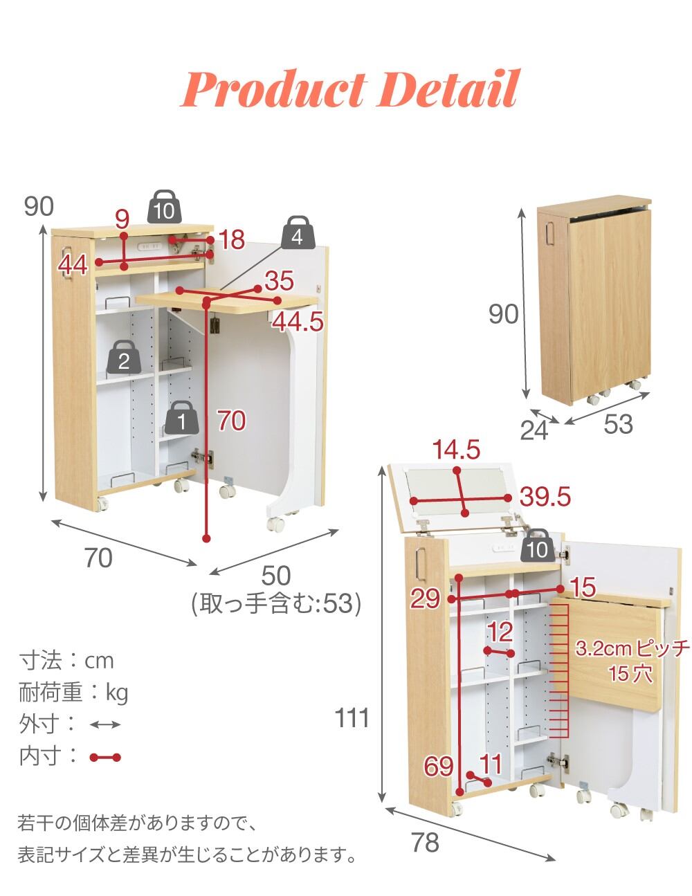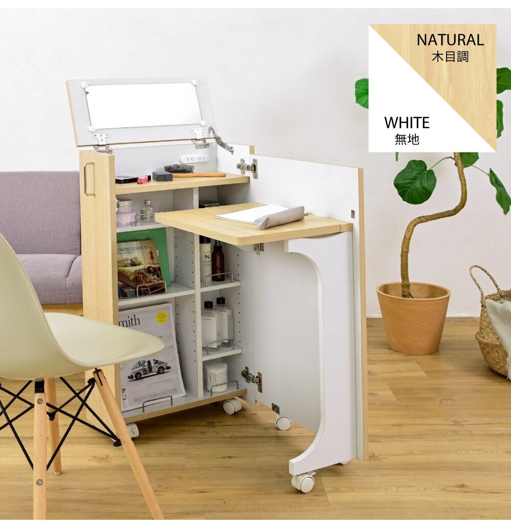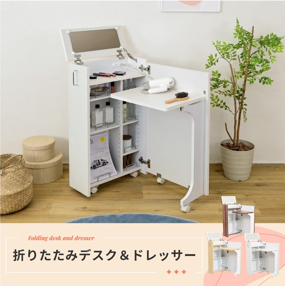 毎日のメイクもちょっとした作業もこれ1つで完結できるドレッサー&デスク。折りたためばわずか24cmのコンパクト設計ながら収納スペースも充実。キャスター付きなので使いたい場所にすぐ移動できます。