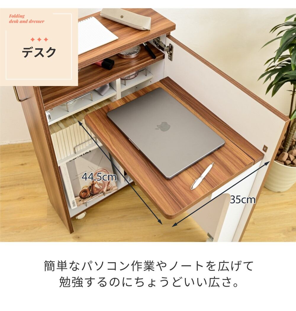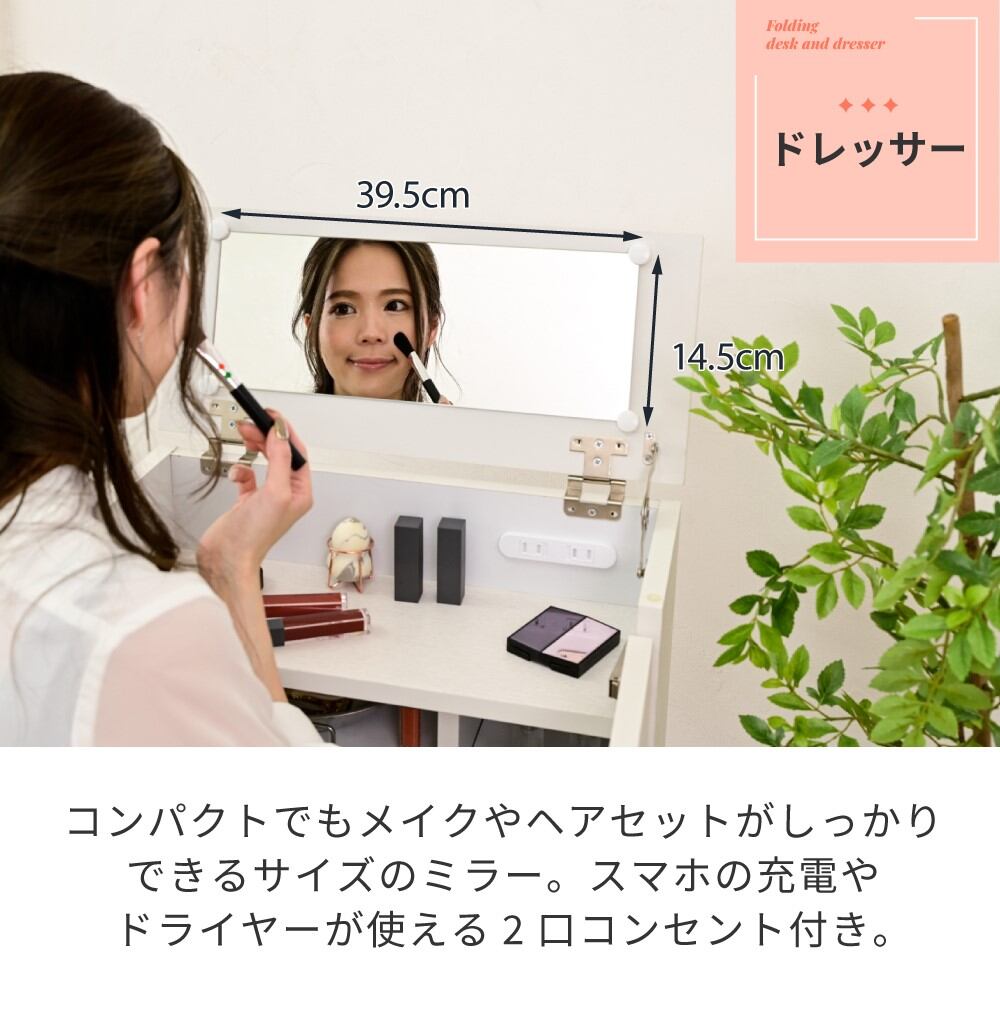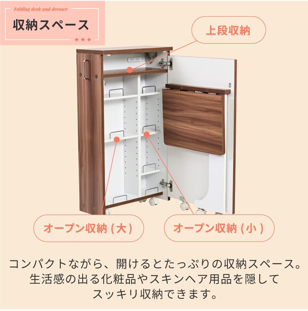 毎日のメイクもちょっとした作業もこれ1つで完結できるドレッサー&デスク。折りたためばわずか24cmのコンパクト設計ながら収納スペースも充実。