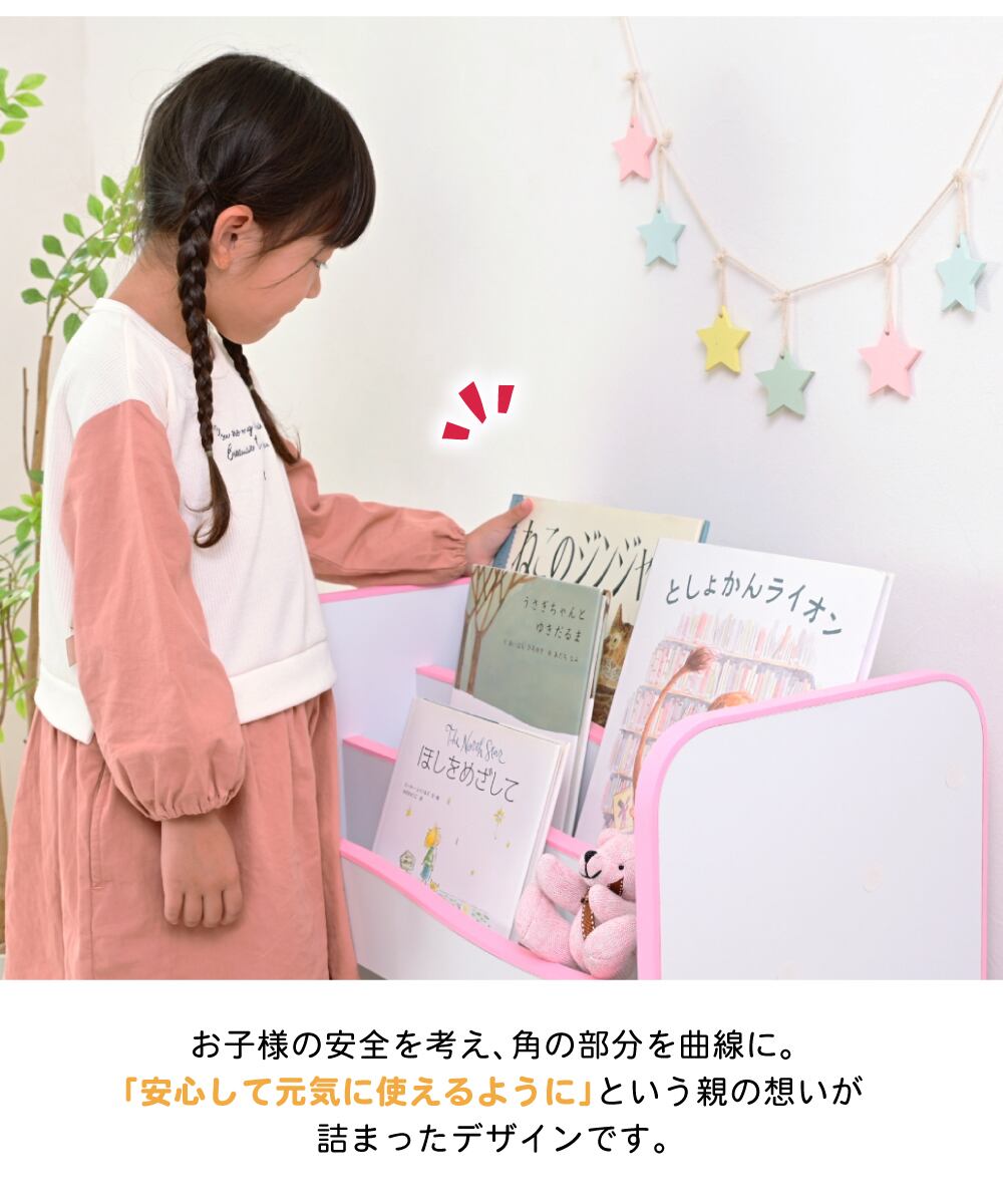 「自分だけの家具」デビューにぴったり!小さなお子様でも安心して使えるキッズ家具シリーズ。表紙が見えるので読みたい絵本も簡単に探せる!