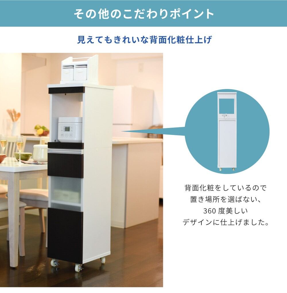 家電の収納に便利なコンセント付きスライド棚と、収納物に合わせて高さ調節ができる可動棚付きのラックをこれ1台で。ハイタイプは収納量も抜群。キッチンのちょっとした隙間に設置すれば、それまでのデッドスペースを有効活用できます。