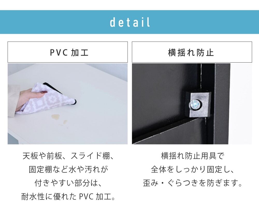 さりげないツートーンが印象的なキッチンシリーズRegal。コンパクトながらもオープンラックやスライド収納、フラップ扉に引き出し収納など、豊富な収納を備えた機能的なキッチンカウンターです。引き出しは2Lのペットボトルも入るサイズ設計。