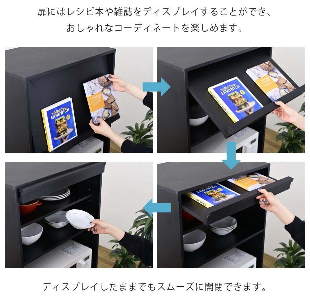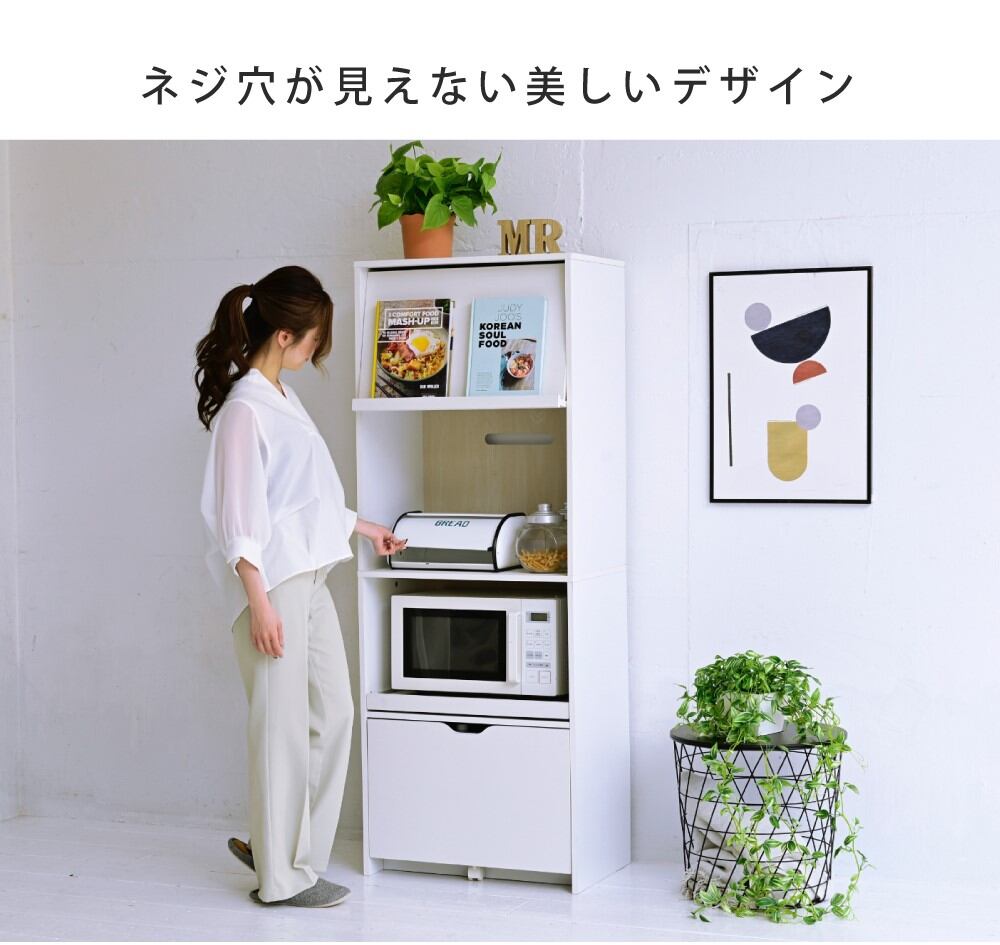 さりげないツートーンが印象的なキッチンシリーズRegal。キッチン家電も食器もまとめて収納できるレンジ台。