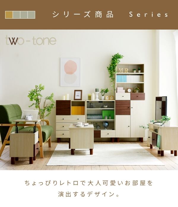 木目のあるナチュラル×ダークブラウンのツートーンで、ちょっぴりレトロな大人可愛いオープン×チェスト。オープン部分にはお気に入りの小物や雑誌などを並べれば「見せる収納」として楽しめます。可動棚なので収納物に合わせて高さを調節できます。こまごましたものは引き出しに入れて見た目スッキリ!同じシリーズ商品と自由に組み合わせることで、お部屋に合わせたレイアウトとオリジナル収納を実現できます。