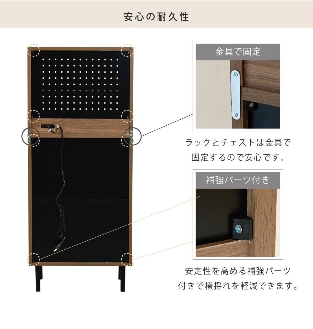 落ち着いた木目調のブラウンとブラックスチールの組み合わせがモダンな印象を与える、北欧テイストシリーズ“Fresser”。4段のチェストに有孔ボード付きのラックが付いたディスプレイチェストラック。シンプルなデザインながら、飾るもので個性を演出できます。