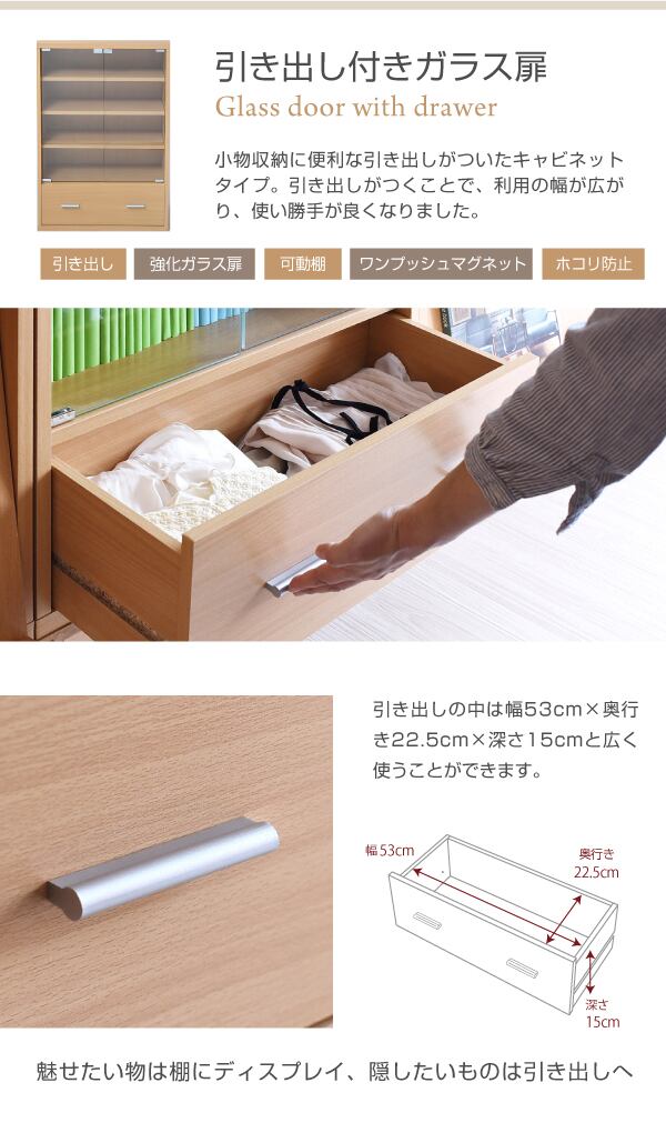 [内寸](上下部)幅56×奥行23.5×高さ35cm(上飾り棚小)幅55.5×奥行2.5×高さ13.5cm(上飾り棚大)幅55.5×奥行2.5×高さ26cm(下飾り棚)幅55.5×奥行2.5×高さ41cm(可動棚)幅56×奥行22.5×厚み1.8cm(3.2cmピッチ5穴)