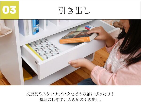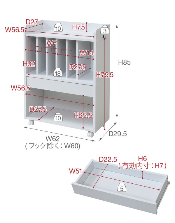 「リビング学習」にぴったりなキャスター付きのランドセルラック。真ん中の仕切り棚は6つに仕切られているので曜日や科目に合わせて収納できます。幅の広い右側は辞書などの収納に。真ん中の引出しはペンケース等や、学校から配られるプリント類に便利です。本体横は左右どちらにもフックの取り付けが可能です。