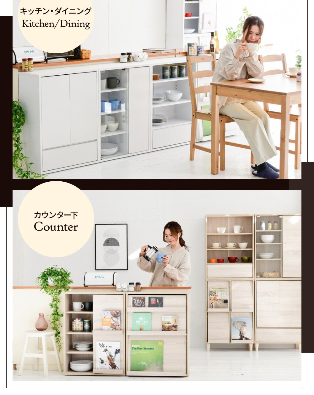 6つのデザインと5つのカラーからお選びいただける6デザインキャビネット”Adatto”。オープン部分にはディスプレイ、引出しには見せたくないものを収納。