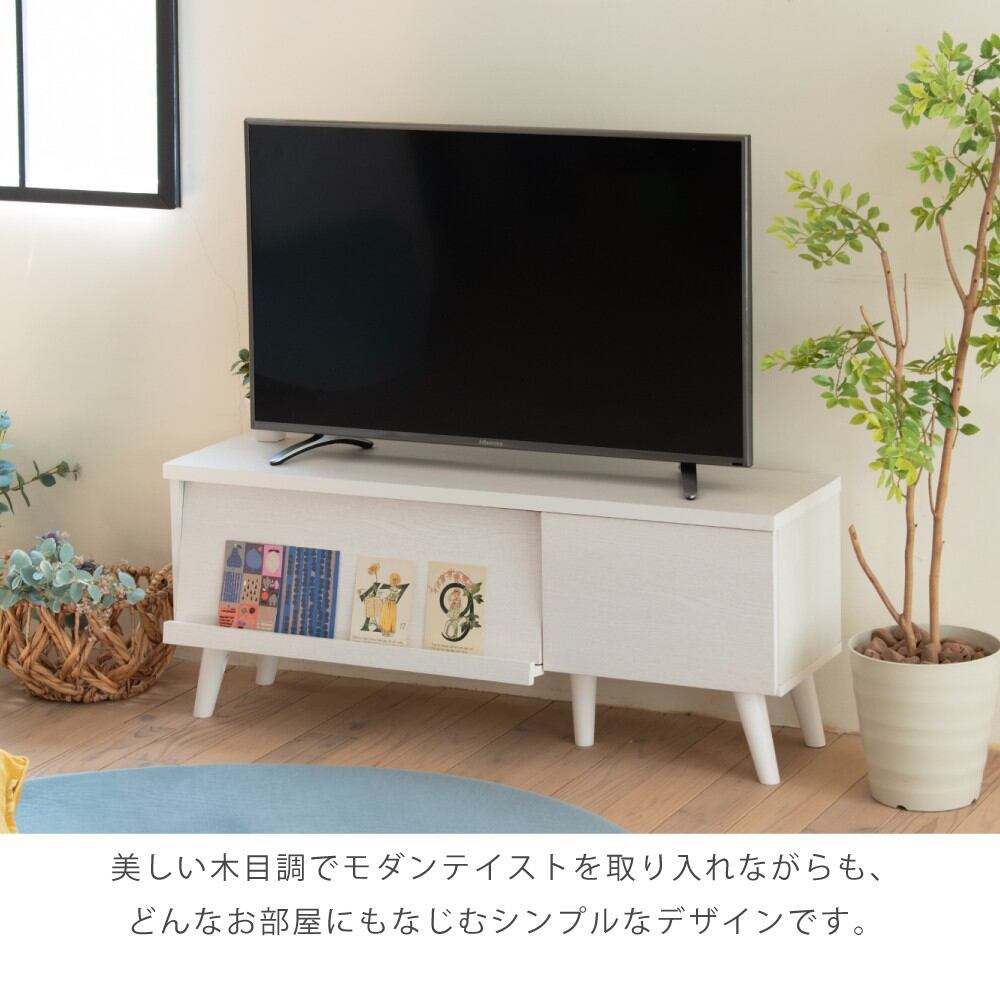 幅105cmの40型テレビ対応。フラップ扉で隠して収納。見た目スッキリでお部屋もスッキリ。どんなお部屋にも馴染むシンプルなデザイン。フラップ扉で収納部分をおしゃれに隠せる優れもの。スマートな見た目でお部屋もスッキリ。脚付きだからお掃除も楽々。