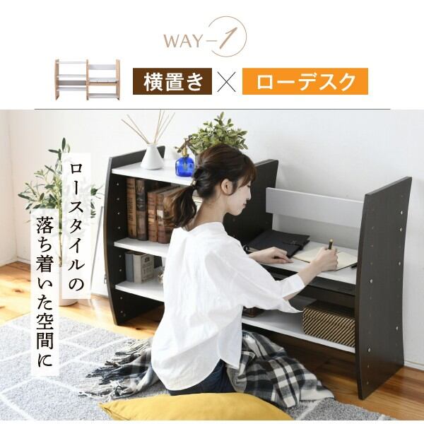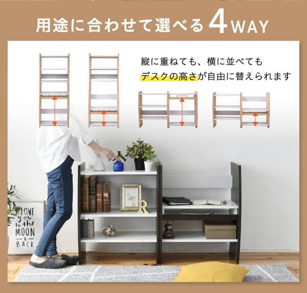 好みに合わせて、イス仕様のハイタイプ、座仕様のロータイプに設定可能。天板も含めて全ての棚が可動式だから、さらに細かく微調整可能。また、縦に積み重ねても、横に並べてもOKなので、お部屋の空間や好みに合わせて自由にレイアウトできます。可動式の棚だから、収納物に合わせて調整できるので、デスク周りの小物などもこの商品一つですっきり収納できます。自由な機能と、特徴的なウェービーな側板デザインが上手く融合し、機能性とデザイン性を高次元で両立しました。