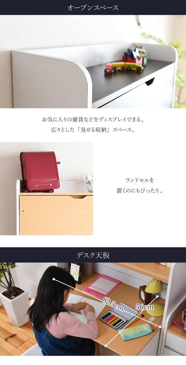 折り畳み式天板は使いたいときだけ広げて使わない時は畳んですっきり、ライティングデスク。薄型で省スペースなのでリビングに最適。お子様の「リビング学習」から、ママやパパのパソコンデスクとしても。上部にはランドセルなどを置けるオープン収納部、下部には扉収納部と3段の引出しで、収納力にも自信あり。コンセント、配線コード穴もあるので、PC、周辺機器の設置もOKです。