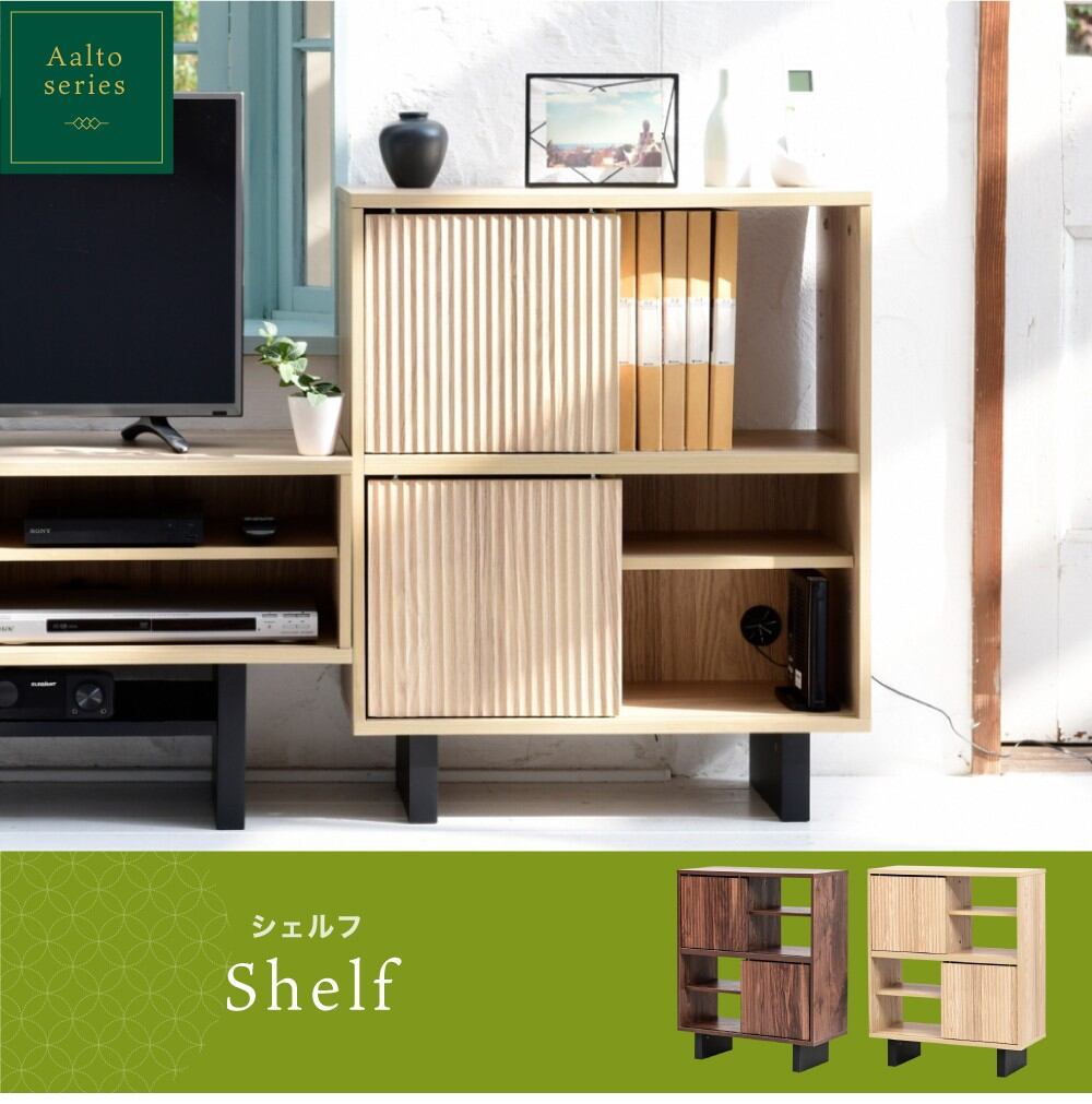 引き戸の波型が印象的な、落ち着きのある和とモダンなテイストを組み合わせた和モダンシリーズ"Aalto"。シェルフは4か所の収納部が備わっており、好きな部分を引き戸で隠せるデザインとなっています。
