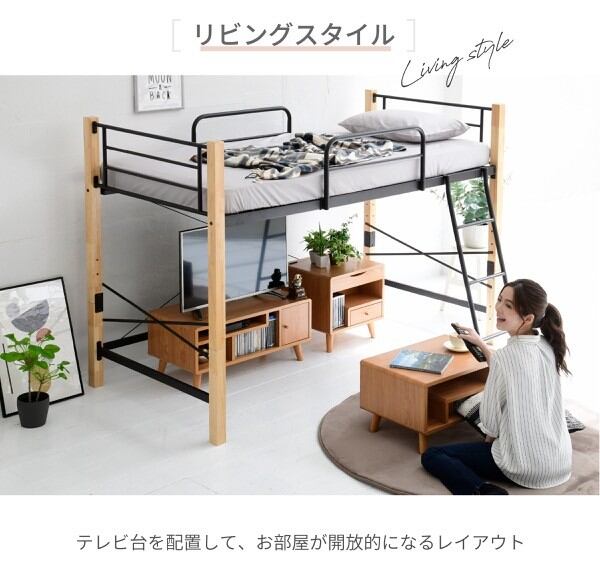 温かみのある天然木とクールなスチールのコントラストがおしゃれな、ちょっと低めのロフトベッド。高すぎないのでどんなお部屋にもおすすめできます。ベッドの下のスペースは収納に使っても、ロースタイルな生活の一部にしても。お部屋の雰囲気にあわせて選べる4カラー展開が嬉しい!