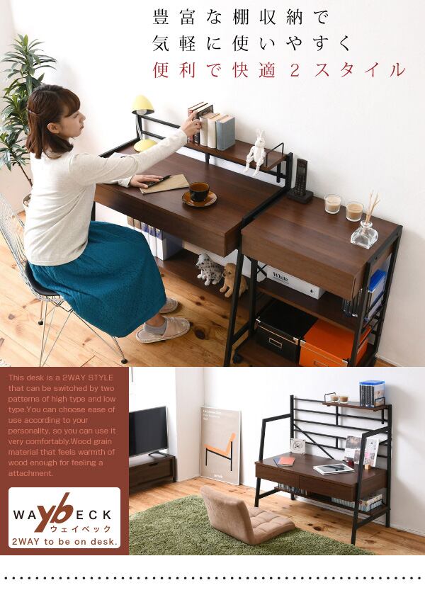 ハイ・ローの2wayで使用できるフレキシブルなデスクの90幅タイプ。棚はひっかけるだけなので、左右はフリーにレイアウトできます。本体にはメラミン樹脂シートを採用しているので、耐熱性・耐水性・耐傷性に優れています。木目とスチールの組み合わせがスタイリッシュなデスクです。