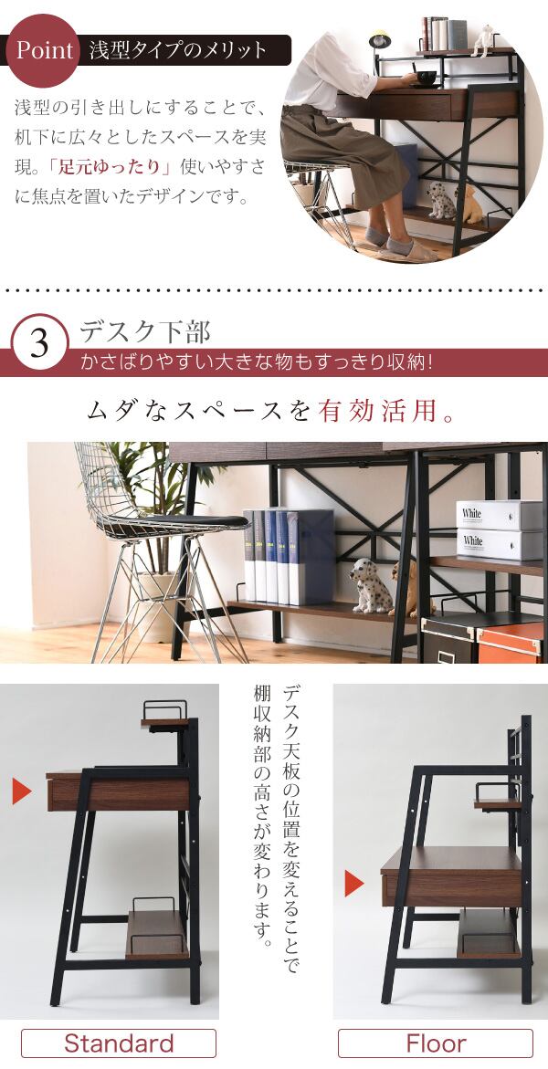 生活スタイルに合わせてハイとローの2段階で高さ調節が可能。A4ファイルや教科書が置ける収納棚付きだから、大人も子供も、仕事にも勉強にも多用途に使える机です。