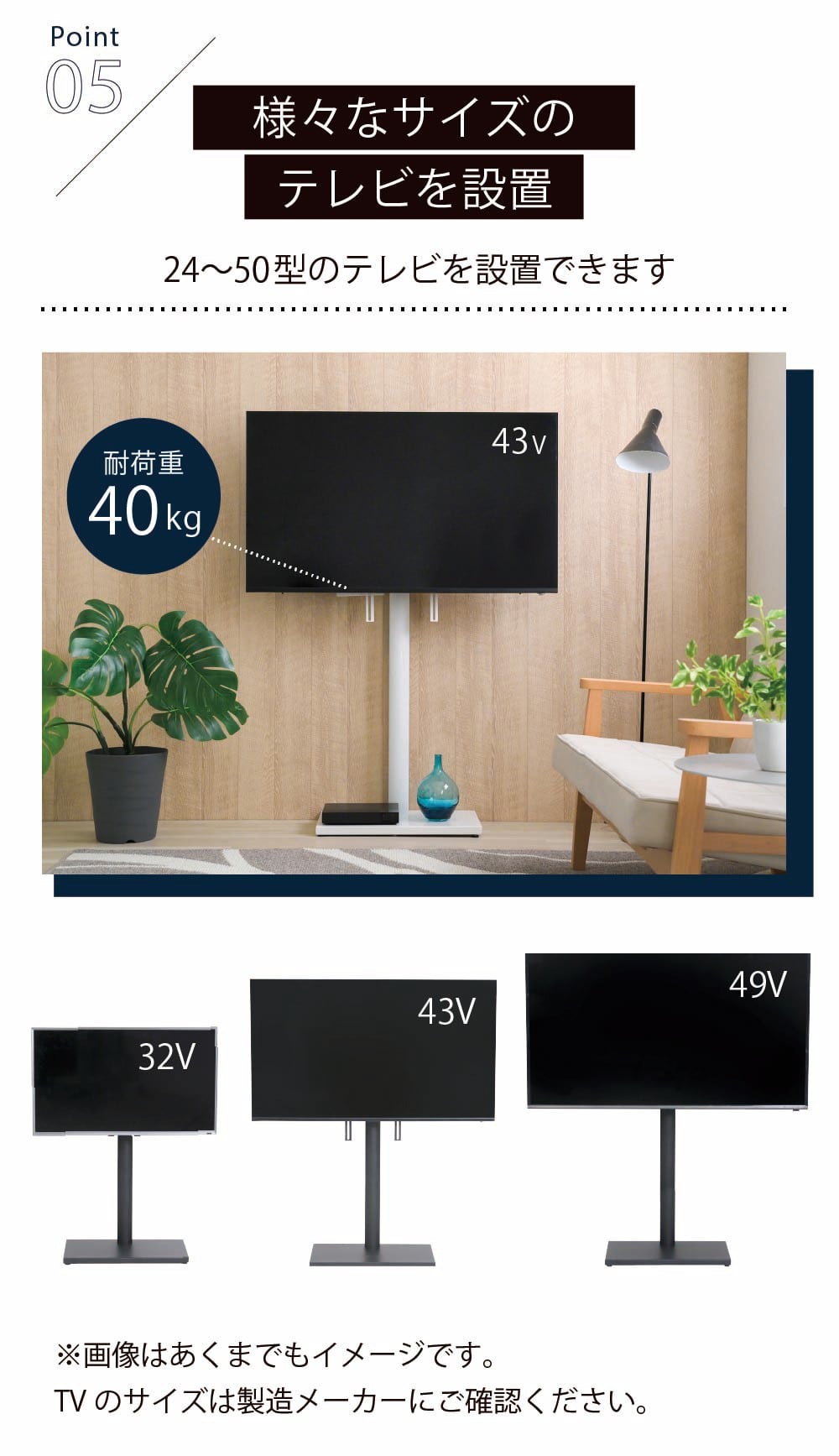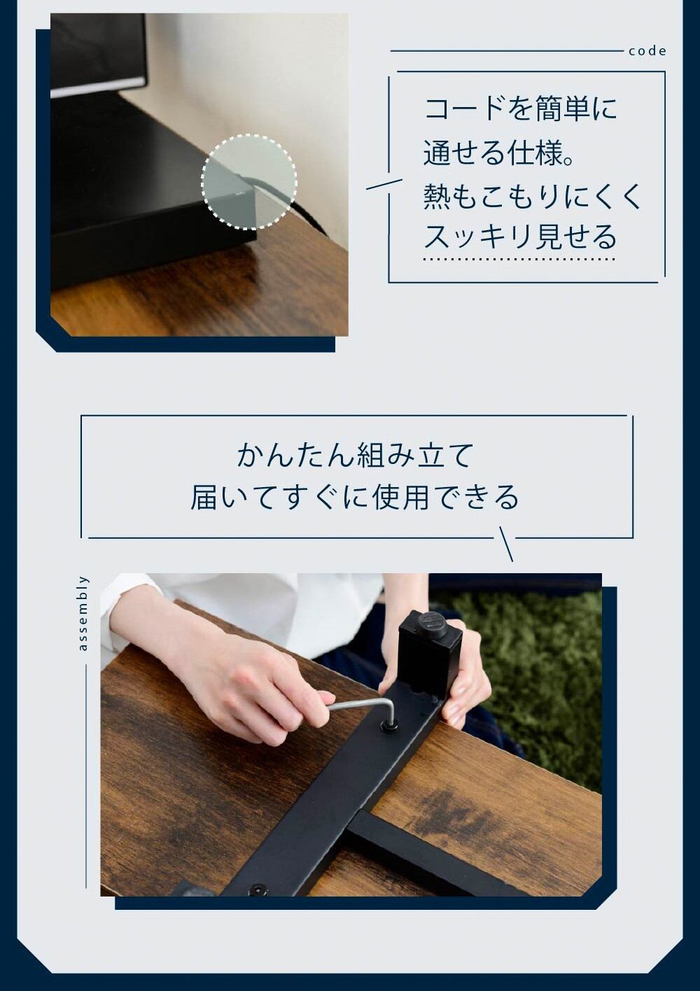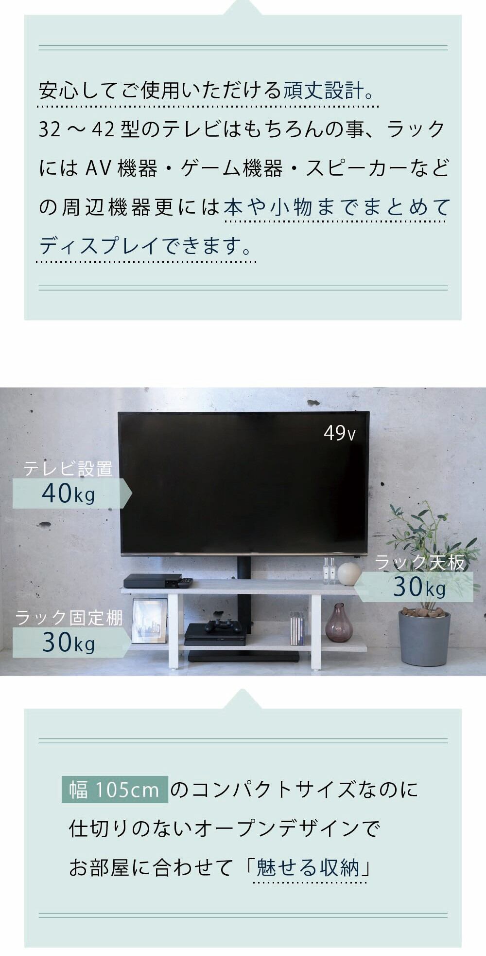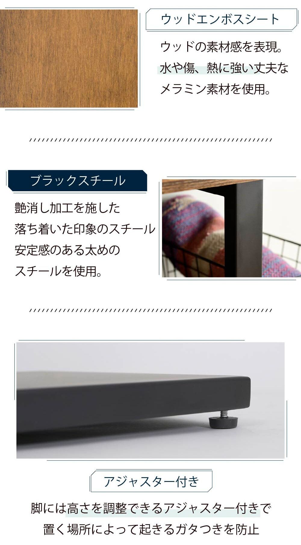 洗練された木目調棚板とブラックスチールの組み合わせが、お部屋をスタイリッシュに演出するテレビスタンドセット。50V型までのテレビに対応し、左右それぞれ30度まで首振り可能で、3段階の高さ調節機能付き。どんな場所からでも快適な視聴体験を提供します。棚板付きでレコーダーなどの周辺機器もすっきり収納。配線も裏面に隠せるので見た目もスマート。さらに背面にはHDDホルダー付きでルーターやモデムも収納可能。機能性とデザイン性を兼ね備えたテレビスタンドです。