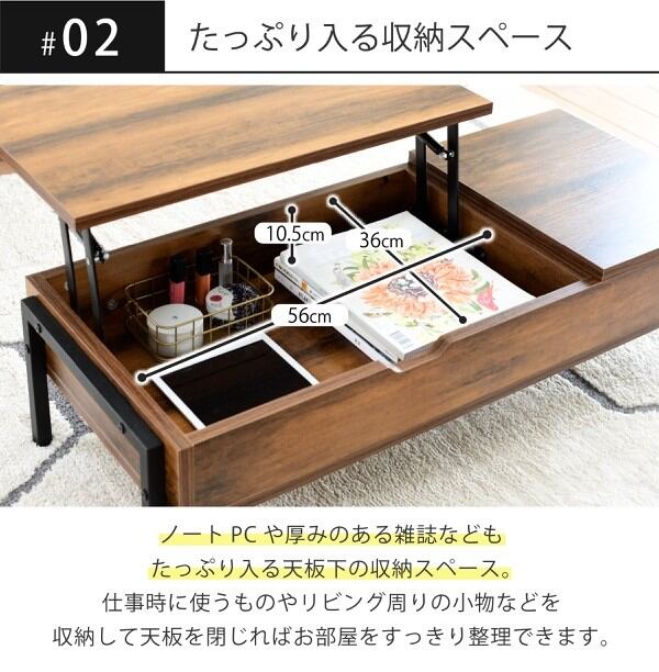 美しさと機能性を兼ね備えた、シンプルながらも深みのあるデザインのリフティングテーブル。普段は天板を閉じてリフティングテーブルとして。天板を上げるとフロアに座って作業するのにちょうどいい高さに。わざわざデスクを置かなくても在宅ワークに対応できるテーブルです。