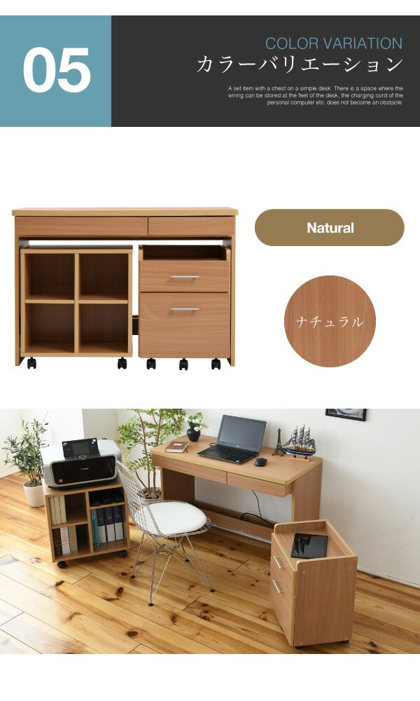 シンプルなデスクにチェストとラックが付いたセットアイテム。デスクの足元には配線が収納できるスペースあり!幅100cm、奥行45cmのコンパクトなデザイン