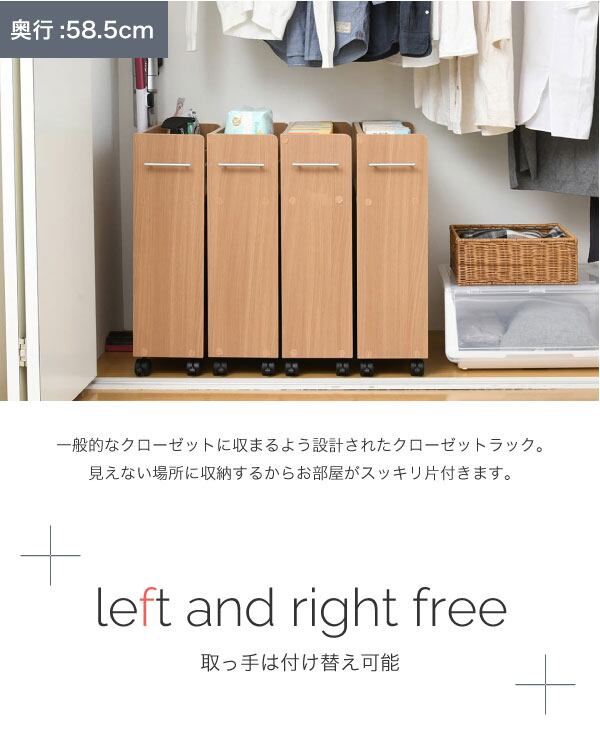 キャスター付きの便利なクローゼットラック4個組。取っ手はどちらにも取り付け可能なので、収納箇所の向きは左右入れ替えできます。本やメディア類や、日用品のストックなどの収納にぴったり。クローゼット内のスペースを有効活用するのでお部屋をすっきり片付けられます。