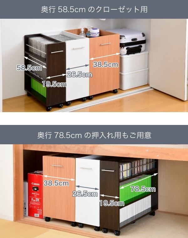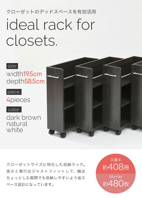 クローゼットにぴったり入る、キャスター付きラック4個組。クローゼット内のスペースを有効活用して、本やメディア、日用品を収納できます!