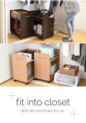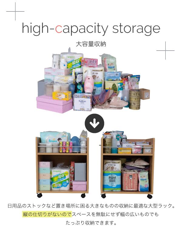 クローゼットにぴったり入る、キャスター付きラック2個組。クローゼット内のスペースを有効活用できます。幅広なので大きな日用品のストックにも最適!