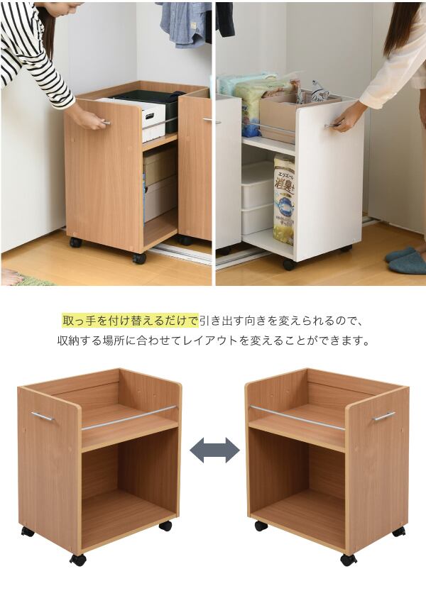 キャスター付きの便利なクローゼットラック2個組。取っ手はどちらにも取り付け可能なので、収納箇所の向きは左右入れ替えできます。幅が広いので収納場所に困る大きな日用品のストックにも最適。クローゼット内のスペースを有効活用するのでお部屋をすっきり片付けられます。