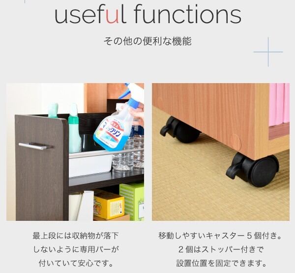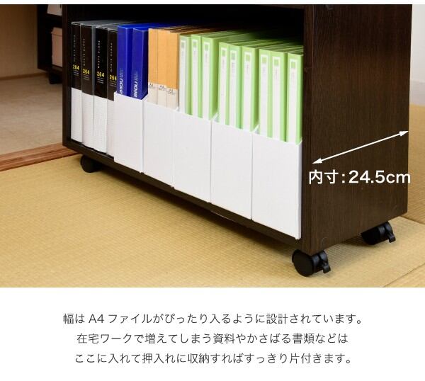 キャスター付きの便利な押入れラック2個組。取っ手はどちらにも取り付け可能なので、収納箇所の向きは左右入れ替えできます。A4ファイルがぴったり収納できるよう設計された幅26.5cm。本やメディア類や、日用品のストックなどの収納にぴったり。押入れ内のスペースを有効活用するのでお部屋をすっきり片付けられます。