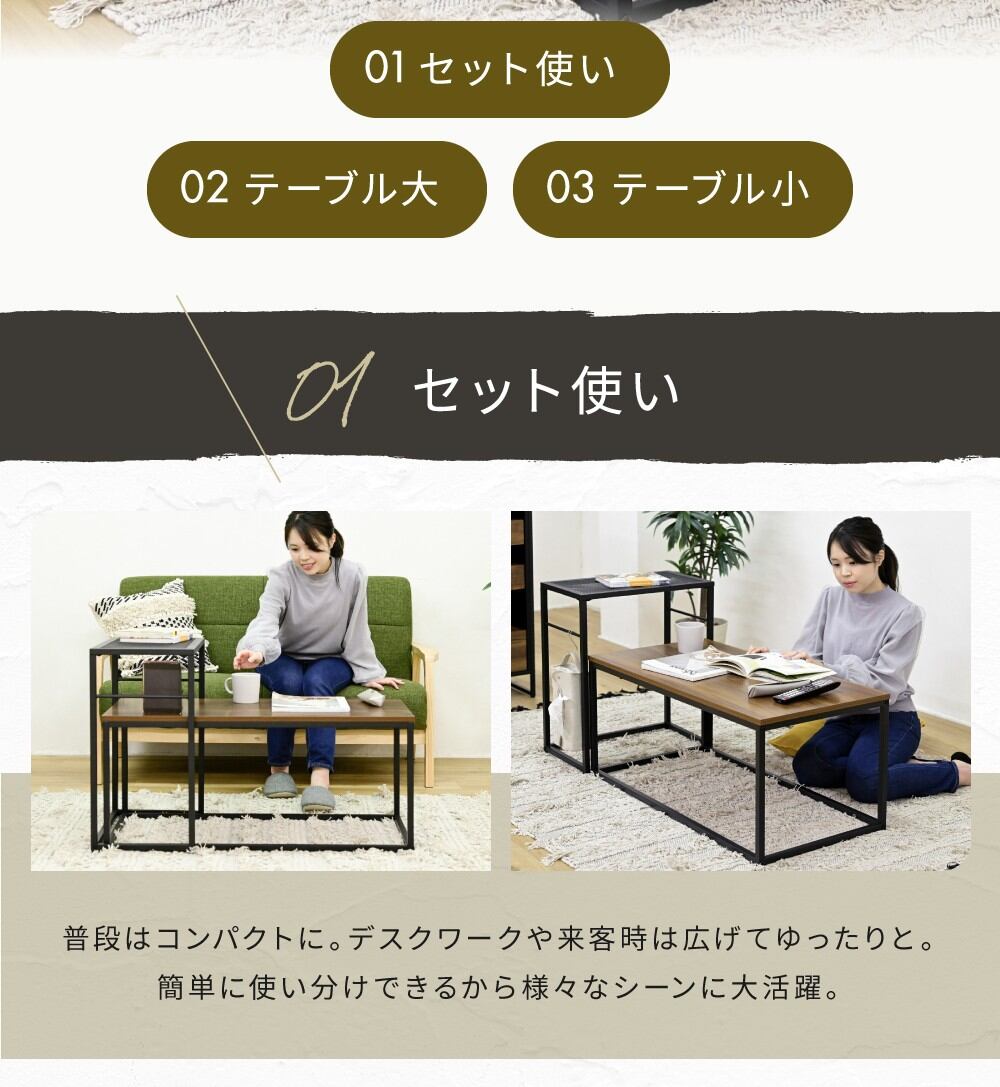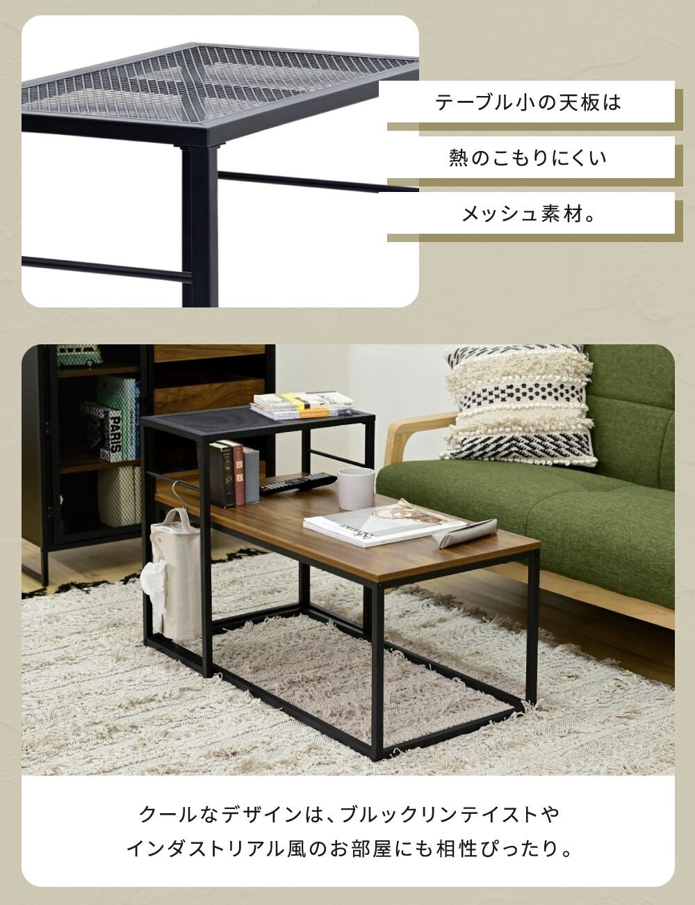 重厚感のあるブラックのスチールフレームと木目の天板が印象的なヴインテージメッシュシリーズ”Rete”のネストテーブルです。普段はコンパクトに使用して、来客時にはワークスペースを広げて使うことが出来ます。