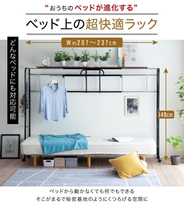 おうちのベッドが進化する、"人をダラしなくするラック"。幅を3段階で調節できるので、今お使いのベッドにもプラスすることが可能です!無駄になってしまうベッド上の空間をハンガーラックや上棚などで有効活用できます。