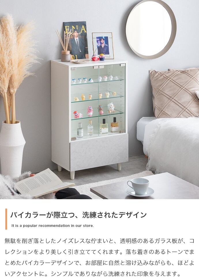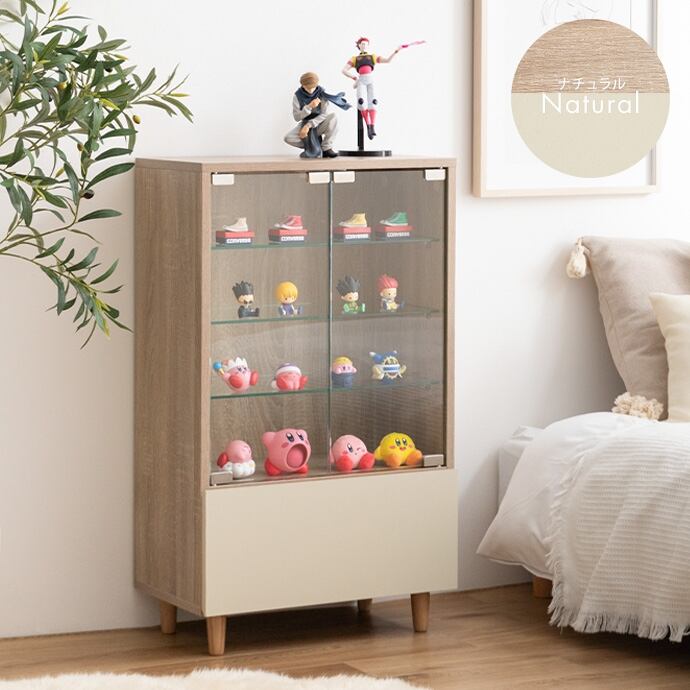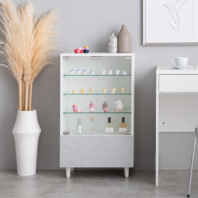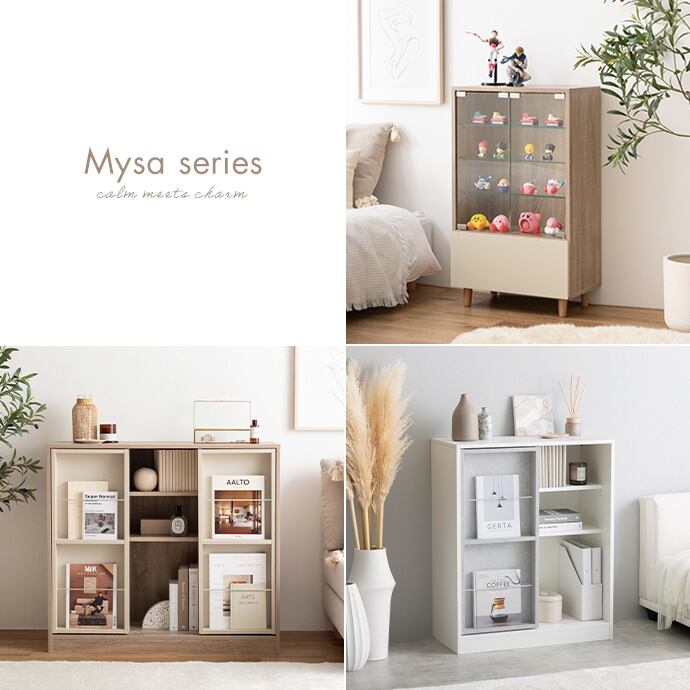 推し活やディスプレイがもっと楽しくなる『Mysa(ミーサ)』引き出し付きコレクションケース。上段にはガラス棚を採用し、コレクションを自然に、より美しく魅せます。下段の引き出しにはペンライトやDVD、普段は使わないけれど大切にしまっておきたい小物をすっきり収納。見せるも隠すもスマートにこなして、好きなものに囲まれて暮らすを叶えてくれる、そんな一台です。