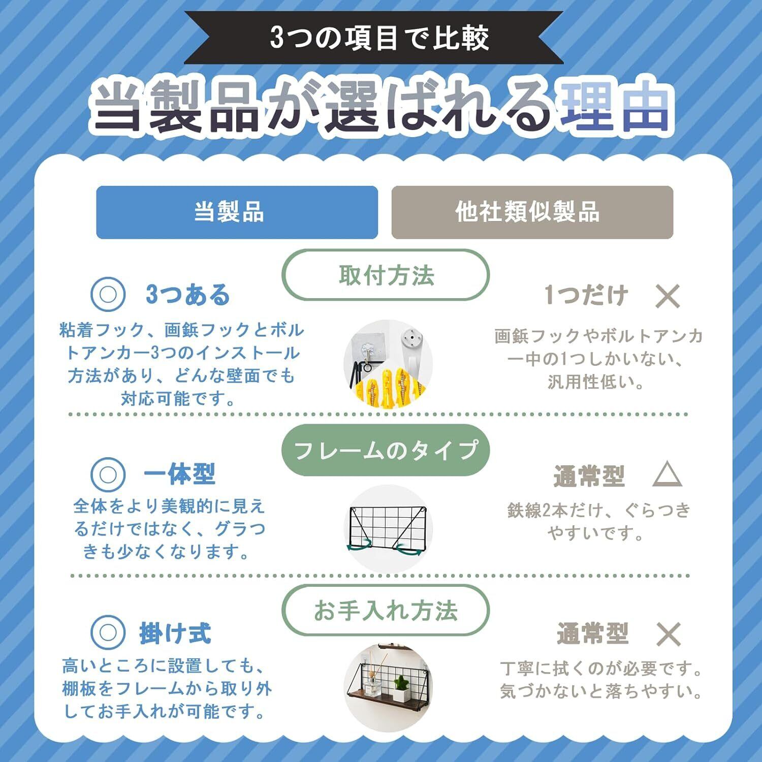 【組立簡単】インストールにはただフレームの両側を展開して、棚板をフレームに掛けて、フックやアンカーで壁に取り付けだけです。取付方法により、約5~15分ぐらいでインストール完了できます。