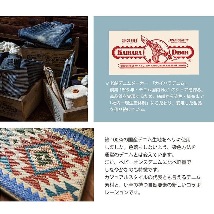広島県のデニム生地メーカーとコラボしたい草商品です。デニムの生地をヘリに使用しました。カラフルない草とデニムは相性ばっちりです。
