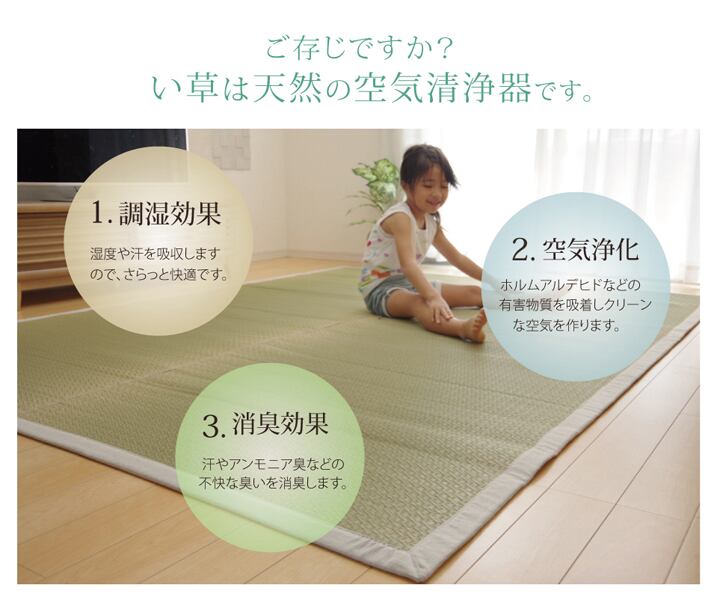 無染土と呼ばれる泥染加工をしていないい草を使用した商品です。無染土のい草はほこりも出にくく、しなやかでい草本来のすべすべとした肌触りの商品です。ヘリには同じ自然素材の綿を使用しており、自然の良さを実感して頂けます。国産(九州産)のい草を使用しており、一本一本が太く、表皮が厚く繊維がキメ細かいので弾力性があり、耐久性に優れています。い草には空気の自然浄化作用、湿度の調節作用などがあります。また汚れにくく、使用するうちに黄金色に変化し味が出ます。